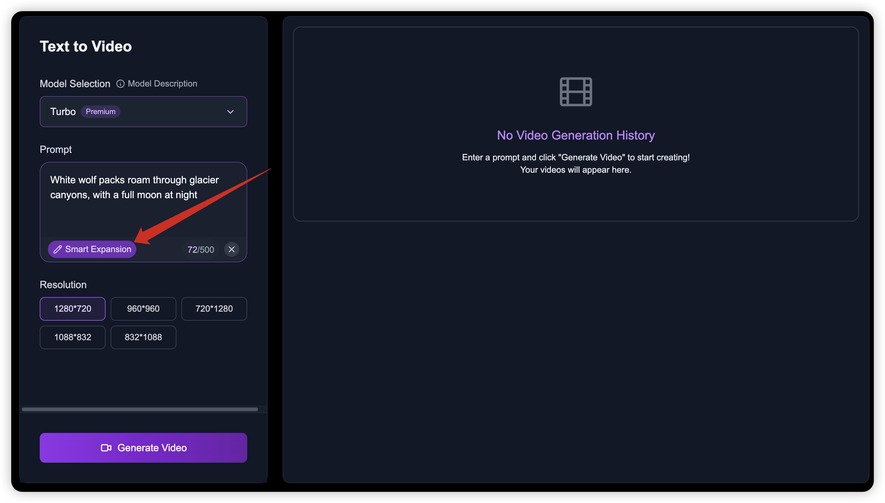 The Smart Expansion feature is provided, which can generate more comprehensive and detailed prompt descriptions based on simple input keywords through intelligent expansion. This significantly enhances the richness and expressiveness of the video visuals. Below is an example of how to use it: